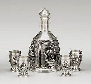 Pewter, raised aid. This set includes a decanter with 4 shot glasses each with a 3 panel motif depicting authentic crusing photography of bygone days. Detailed rope rigging borders frame all three panels. Material: PewterOrigin: Germany